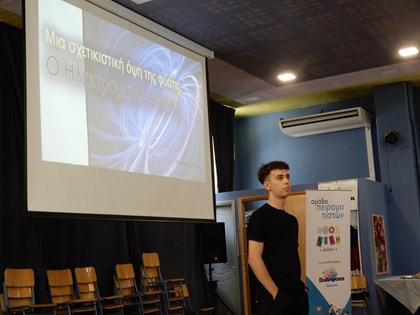 Η ομάδα επιστημονικών δραστηριοτήτων «STEM.inists» του σχολείου μας, μετά από μία μικρή ανάπαυλα λόγω εξεταστικής περιόδου, επανήλθε με την θεσμοθετημένη πια δράση του «προσκεκλημένου ομιλητή». Την Τετάρτη 21 Ιουνίου 2023 (ημέρα του θερινού ηλιοστασίου), ο τριτοετής φοιτητής του τμήματος Φυσικής του ΕΚΠΑ, Χαραλάμπης Παπαδάτος έκανε μια διαφωτιστική παρουσίαση με θέμα: «Μια σχετικιστική όψη της φύσης – Ο Ηλεκτρομαγνητισμός».